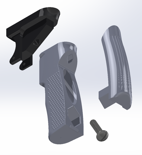 The Backstrap Molasses AR-15 grip has a grip angle of only ~10 degrees from perfectly vertical. Normally, this would place the hole for the screw right in the middle of the backstrap, so I made that a separate piece that is pressed into the front portion after it is screwed onto the receiver. This also allows for multicolour grips with a low cost printer like an Ender 3 or to print the backstrap out of a flexible material like TPU for added comfort.