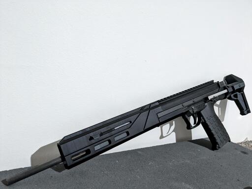 Rifle conversion for the stock Keltec CP33. Features include forward charging handle, handguard, collapsing PDW style stock.